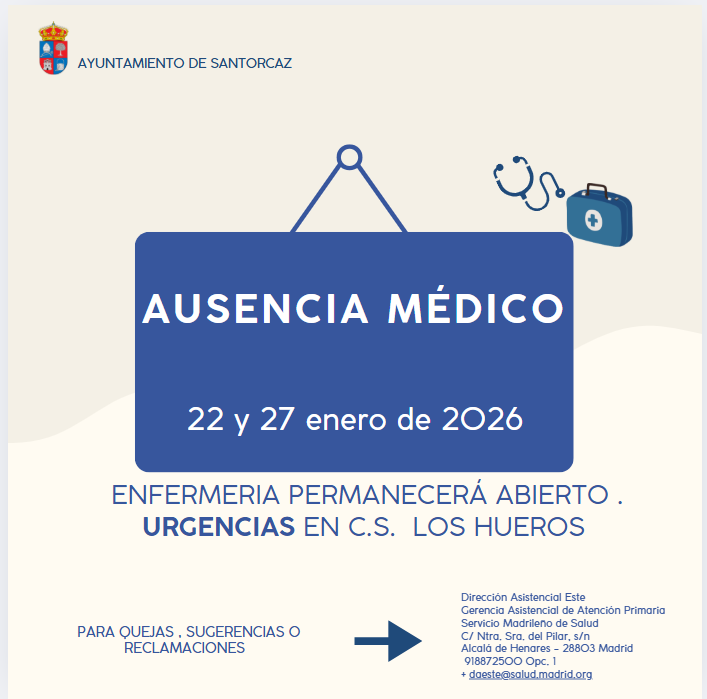 Desde la Dirección Asistencial nos informan de la situación asistencial en el Consultorio Local de Santorcaz y Anchuelo para viernes día 30de enero de 2026.- Ausencia de MF el día 30 de enero en el consultorio de Santorcaz en el tramo horario de 13:00 horas a 15:00 horas. El Consultorio permanecerá abierto en su horario habitual con Enfermería. Se derivan la atención no demorable al CS Torres de la Alameda.