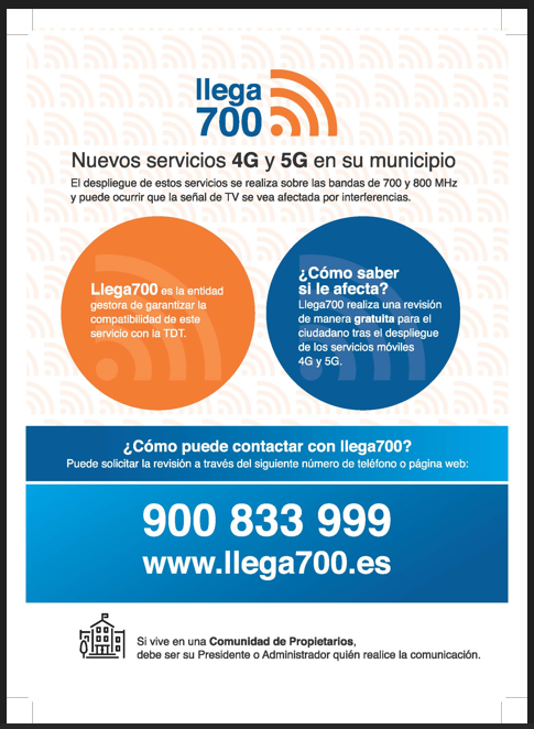 Llega700 es la entidad gestora encargada de ofrecer los servicios que garantizarán la compatibilidad entre la puesta en marcha de la emisión móvil 4G y 5G en las bandas de 800 y 700 MHz, respectivamente, y la recepción del servicio de TDT.