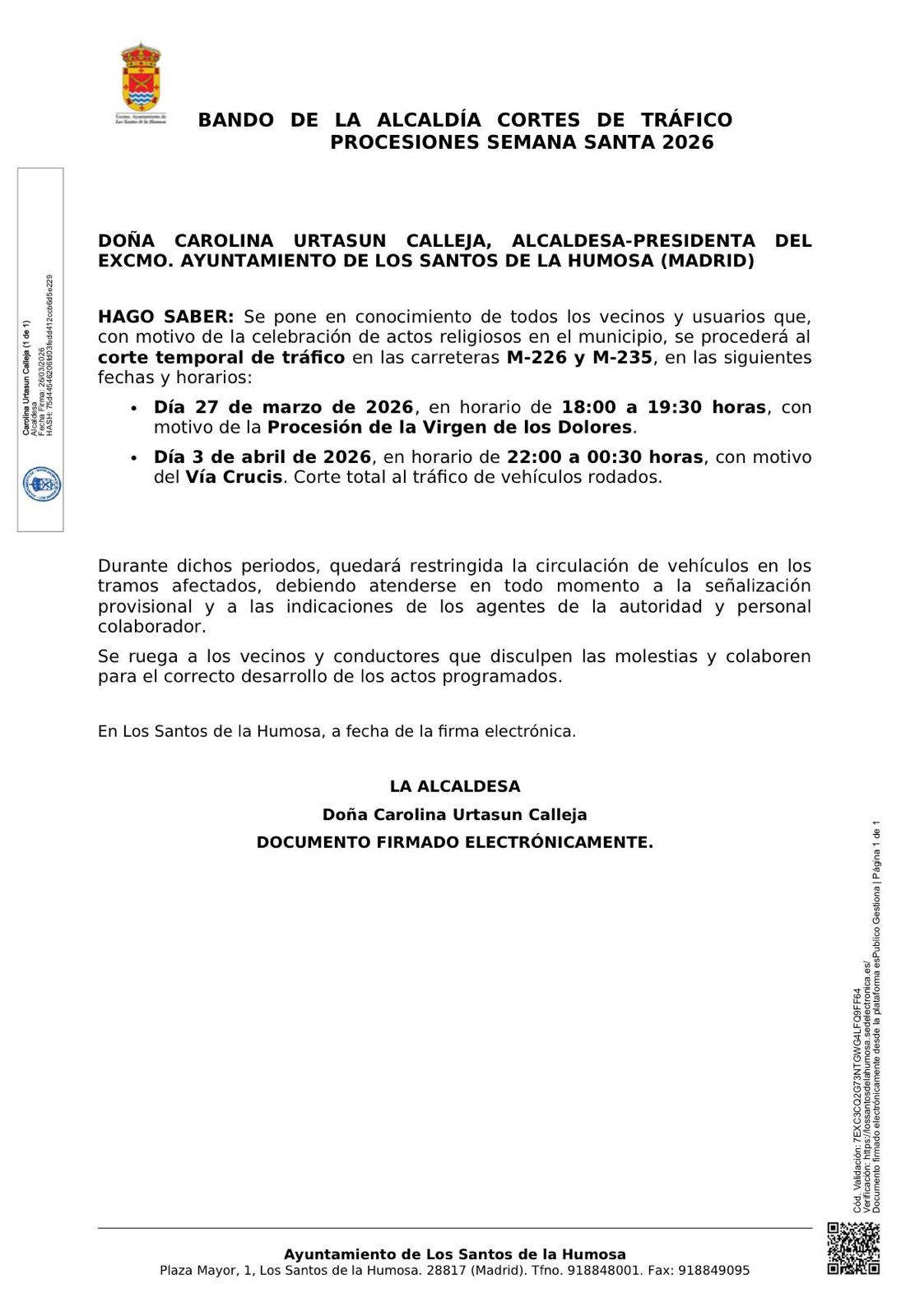 📢📢‼️‼️CORTES TEMPORALES TRÁFICO M-226 Y M-235 CON MOTIVO DE LAS PROCESIONES SEMANA SANTA.