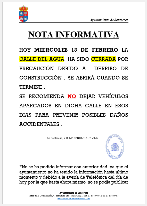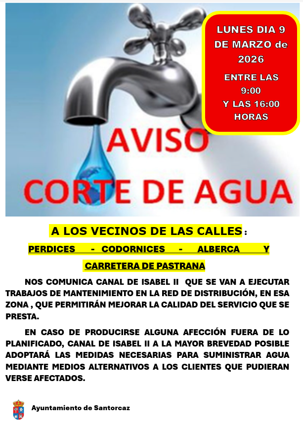 El Consultorio de Santorcaz, debido al temporal, para hoy día 28 de enero permanecerá cortado. Se deriva la atención no demorable al CS Torres de la Alameda.