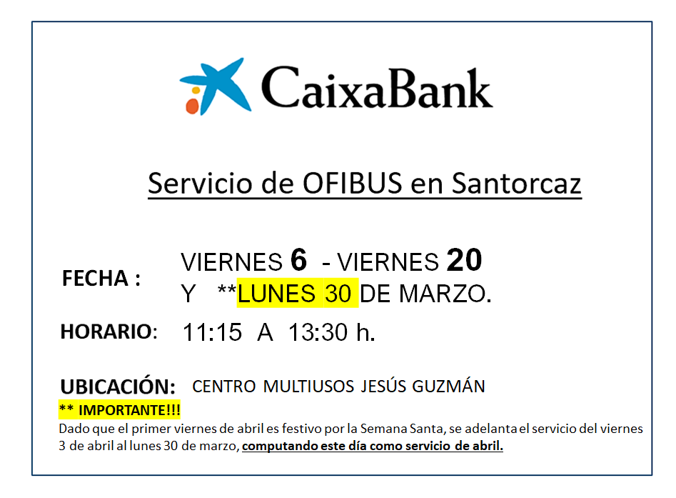 📢📢SERVICIO OFIBUS CAIXABANK MARZO DIAS 6,20 Y 30 . INFORMACIÓN CARTEL ADJUNTO.