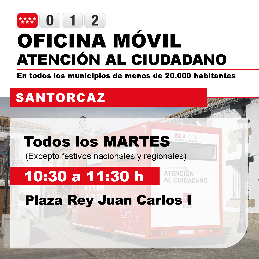les recordamos que la oficina móvil del servicio de información de Comunidad de Madrid sigue ofreciendo atención al ciudadano los martes de 10:30 a 11:30 Horas. habitualmente en la Plaza de Juan Carlos I excepto estas ultimas semanas que debido a las obras se está atendiendo junto al centro multiusos Jesús Guzmán.Servicios que se ofrecen